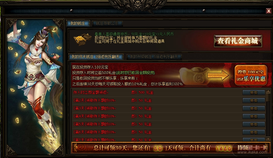 钱庄主要为存入元宝兑换大量礼金,根据返还方式分为“月卡钱庄”和“升级钱庄”。