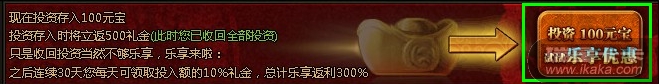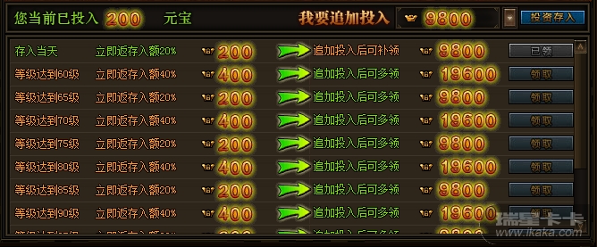 但是升级钱庄中,玩家还可以根据需求,进行追加投资,追加投资后可以立即补领奖励,最大可投入10000元宝: