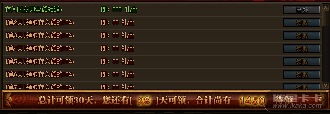 l 月卡钱庄,任何等级的玩家可以存入,每个月可存入100元宝,可立即返还500礼金,并在接下来的29天内每天可以领取礼金奖励;