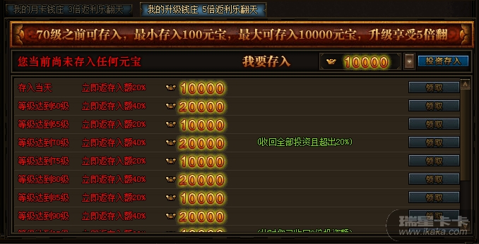 玩家可以根据自己的需求,存入一定的元宝,存的越多,升级后钱庄返还的越多;