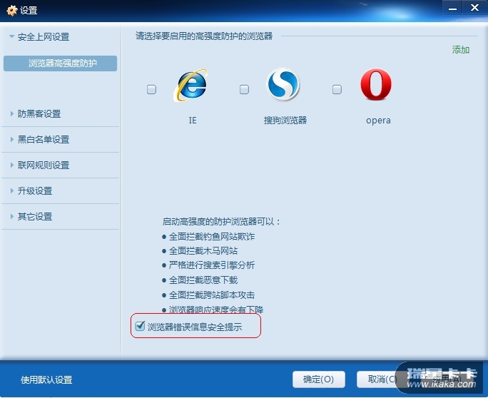 请楼主将防火墙设置中,【浏览器错误信息安全提示】取消勾选就可以了。