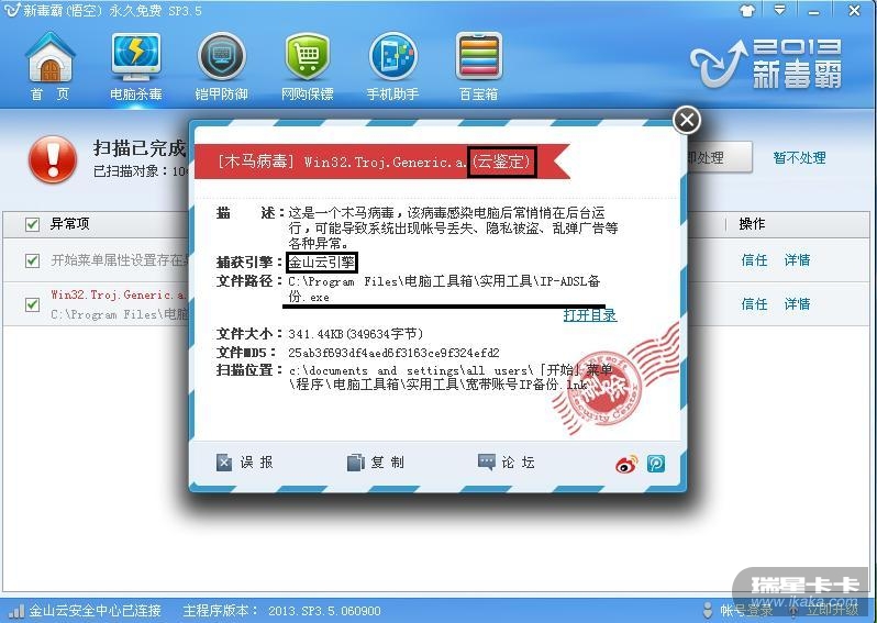 瑞星对于技术也不要太保守了,适当的放开好像也不是坏事,就好像金山一样,技术一般,但我够开放,照样有大批的粉丝。像上面的金山截图,详细的描述不仅有助于解开用户心中的疑虑,而且有助于像用户推广自己的技术标准:kaka3: