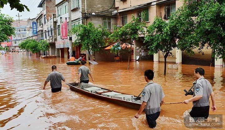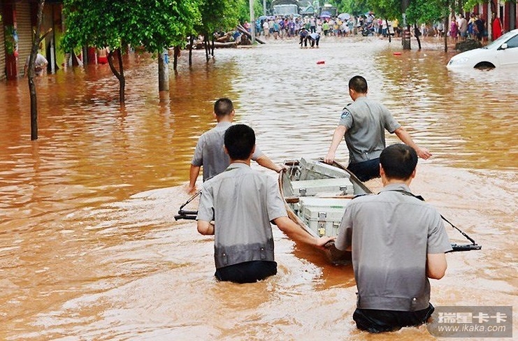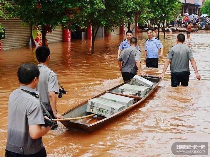 7月1日,重庆,潼南柏梓镇农业银行的押钞人员,将现钞运转至安全地域。当日,重庆,受暴雨影响,潼南县柏梓镇、崇龛镇、太安镇等发生洪灾,街道和村庄被淹,数千群众被洪水围困。潼南柏梓镇农业银行的押钞人员,将现钞运转至安全地域。