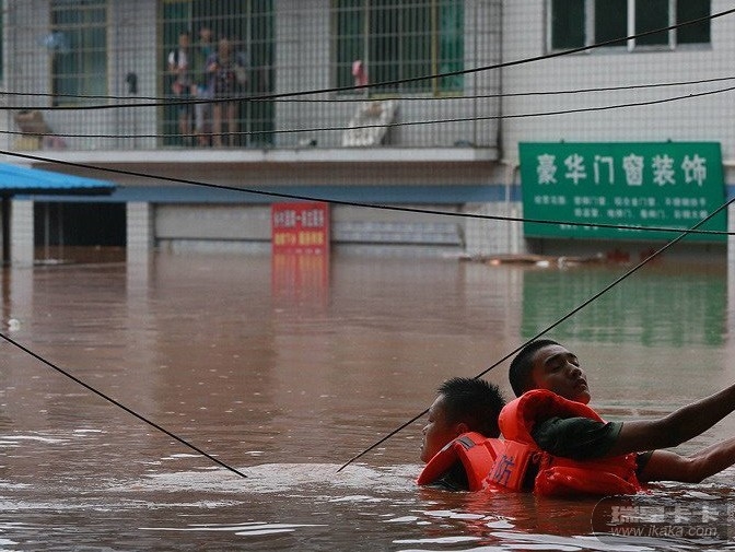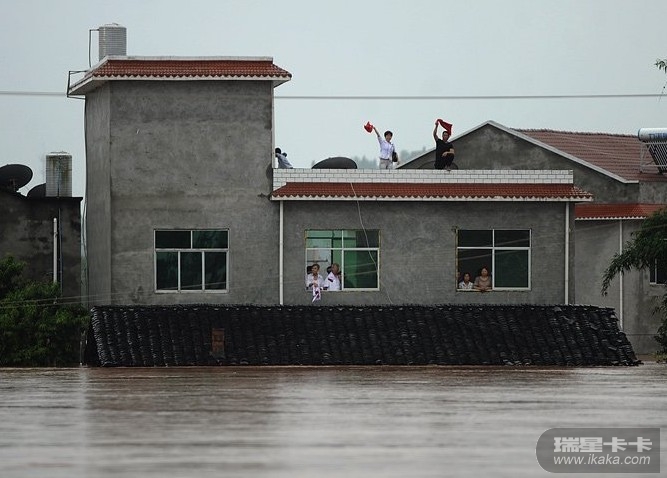 7月1日,重庆潼南县因遭遇55年来最强降雨,多个乡镇变成泽国,大量居民被洪水围困。图为村民正在自家屋顶上求救。