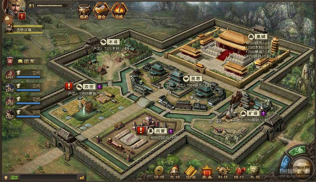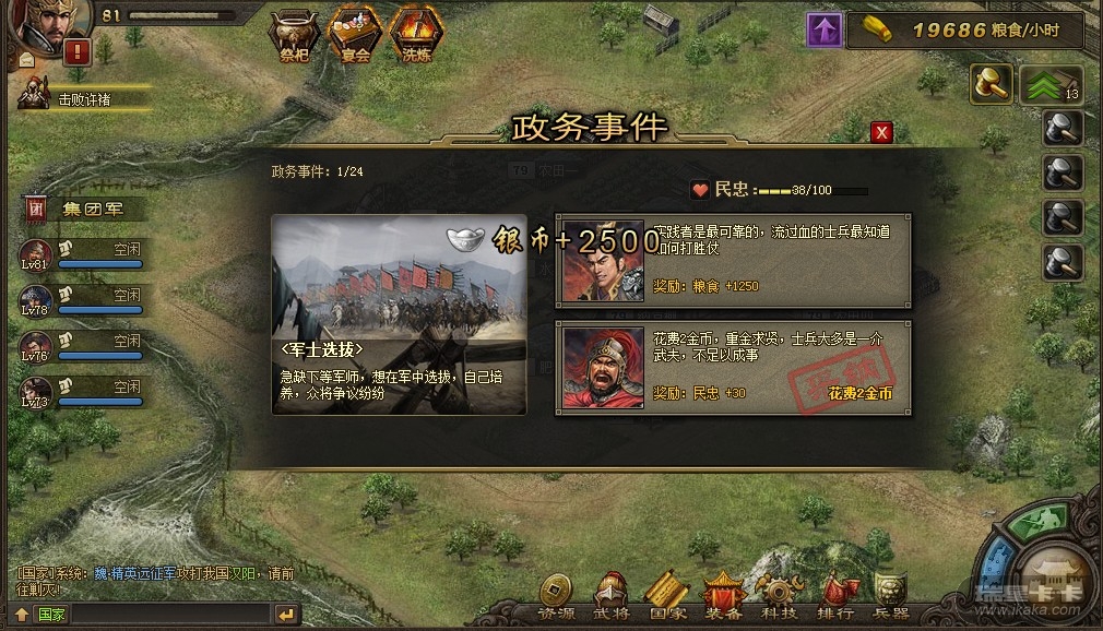 玩家通过从2种方案中选择一种政务处理方法以获得相应政务奖励的资源或民忠,资源可用来从事各项实力提升,而民忠累积到100后奖励大量资源。