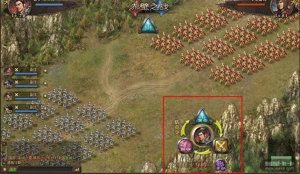 玩家部队从左下出场,敌方部队从右上出场,对决中根据攻防实力及战术的运用消耗对方兵力。