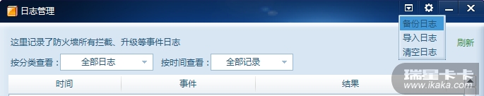 日志导出方法:鼠标右键退出托盘处防火墙图标>>查看日志>>功能菜单处选择备份日志,将生成的db文件压缩发来。如下图: