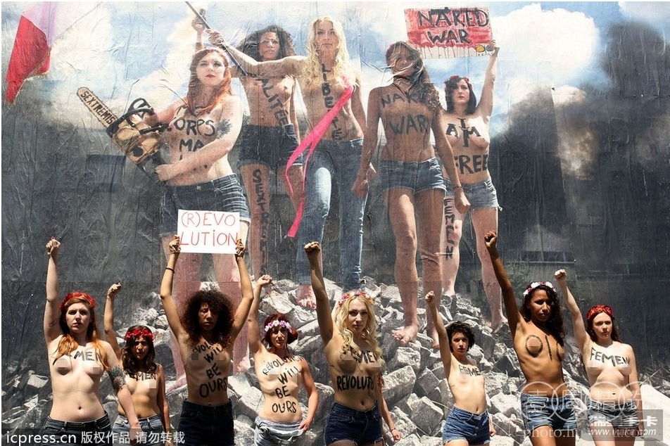 7月14日,法国巴黎,数名女权主义者为涂鸦艺术家Combo的新作“Femen”揭幕,参与者全裸力挺,再现涂鸦场景,以此宣扬一场“裸抗到底的战争 Naked War”。