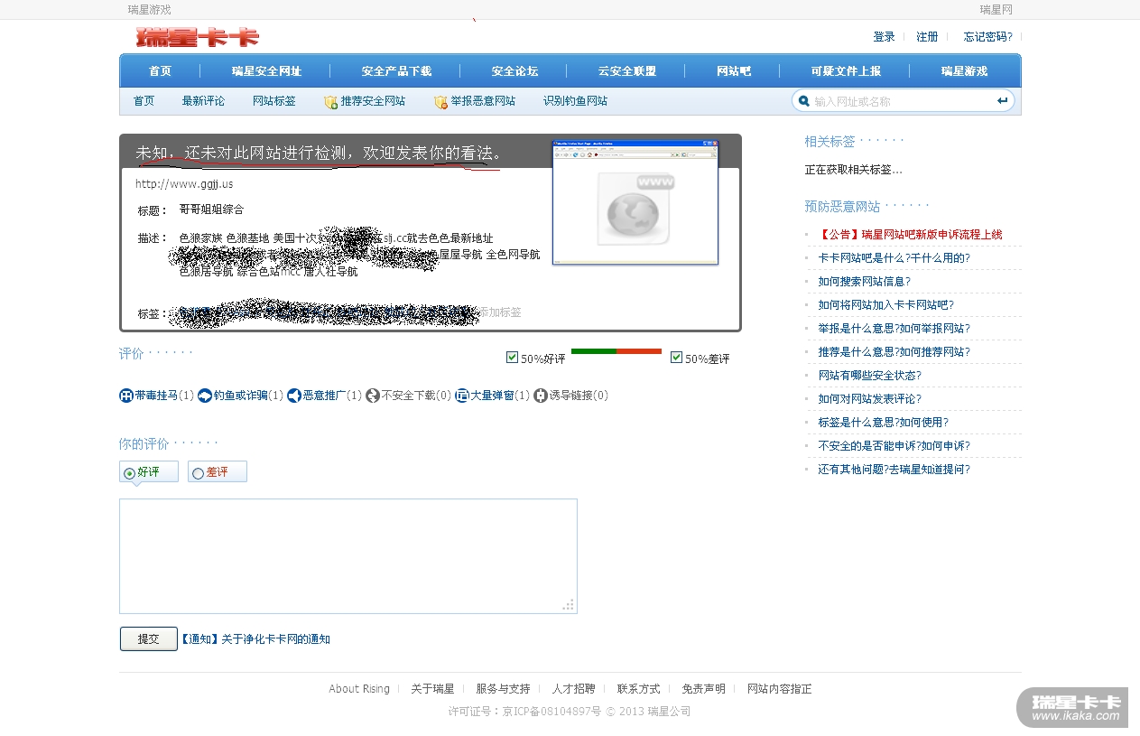 www.ggjj.us一直未检测,事先声明这是我无意中发现的xxx,肯定是恶意的不用多说。说起v16的系统清理个人体验不是很给力,金山卫士什么的动不动两百多兆垃圾,而瑞星小于1k,.这是体验上的。至于百度不显示盾牌,我了解了下,原来百度动用了律师函这种神器,所以我还是理解瑞星的。至于v16防火墙报错,是他安装时卡在99时就不动,应该属于个案,早就独立解决了,在这里提下,是提醒用户遇到类似情况,不要着急。我们应该对国产的有信心,试试把电脑重启,找到瑞星文件夹重命名后修改只读属性再把它删除,从官网下载安装包即可