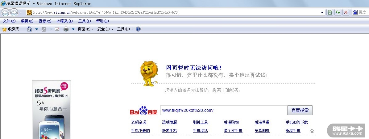 http://hao.rising.cn/weberror.html?e=404&;p=1&u=d3d3LmxrZmpka2Zqa2pkLmNvbS8= 这类的地址,而hao.rising.com不就是你们瑞星的网址么?你说你们流氓不?