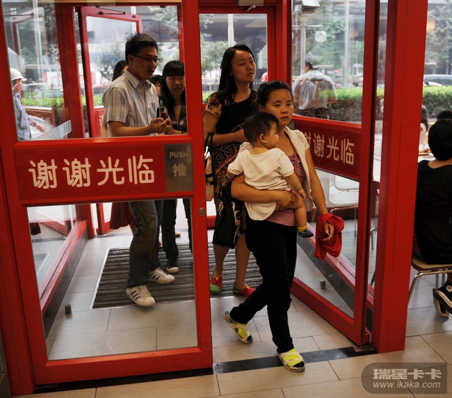 2013年8月23日,未婚妈妈姜女士带着自己9个月的宝宝住在北京朝阳区呼家楼附近一肯德基店内。据了解,来自湖北省大冶市的姜女士,因未婚怀孕遭男友抛弃,后与养父母产生矛盾而断绝关系。无处落脚的姜女士,自7月初起便一直“安家”于此。图为姜女士抱着小思思走进肯德基。