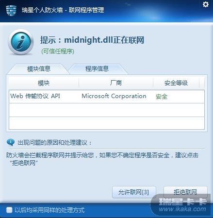 启动瑞星信任程序智能模式识别模式 是自动允许可信任的程序连接网络,1楼的截图,确实是允许连接网络了,没有拒绝啊。