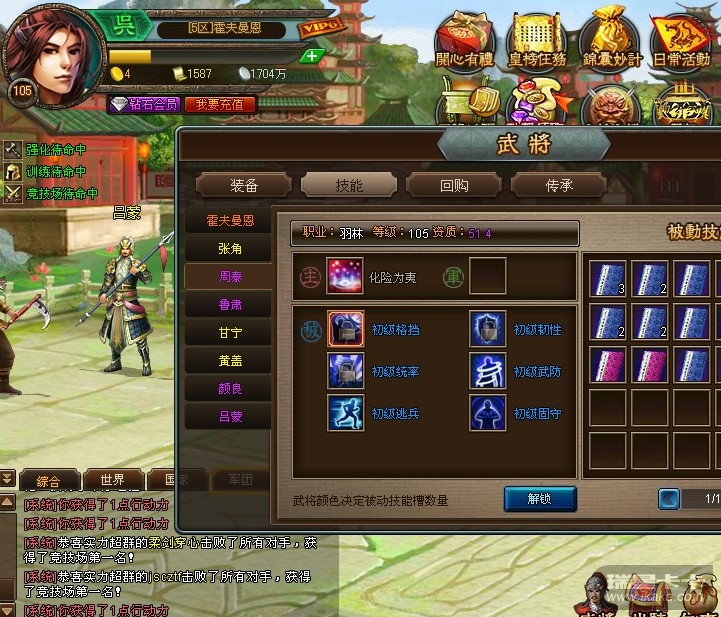 原五区现并入三区的玩家,名叫霍夫曼恩,要将在用的武将周泰传承给吕蒙,但传承对话框中找不到周泰。主将的技能图如下: