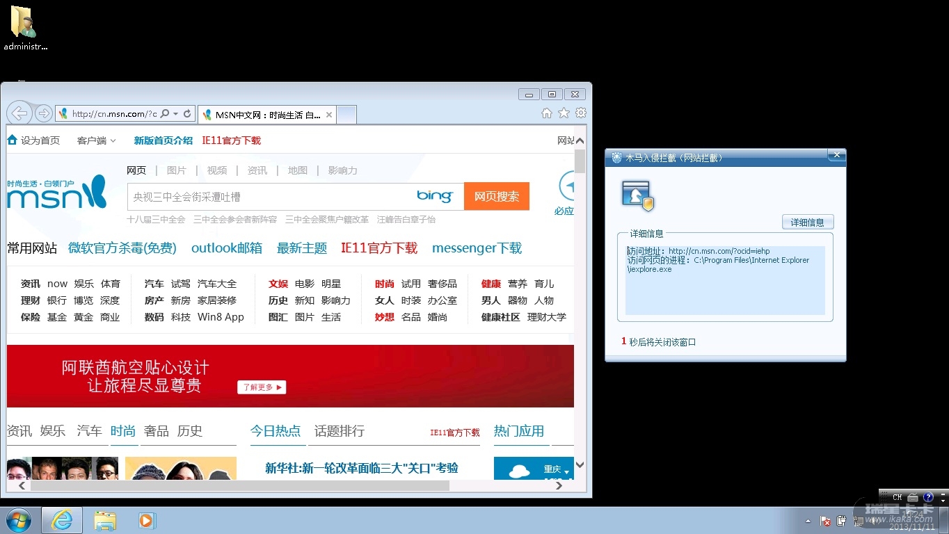 已经执行过全盘杀毒和升级IE浏览器至IE10(原先是IE8),还是一样,甚至把IE浏览器添加进白名单还是无济于事。