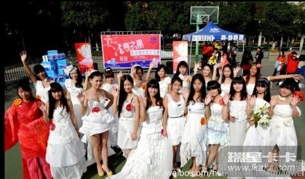 2013年11月15日,湖北武汉市,经济学院法商学院社团联合会举办的法商之星婚纱设计大赛上,25位“模特”身着3米卫生纸制作的创意设计婚纱行走校园,惊艳全场。该校社团联负责人胡敏介绍,该活动旨在倡导低碳环保理念,培养学生实践创新能力。