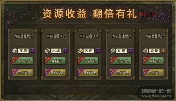 活动内容:活动期间,直接开启任意资源区3倍收益(兵营区为2倍)模式,达到以下要求,即可领取同倍收益的资源令奖励。多开多送!