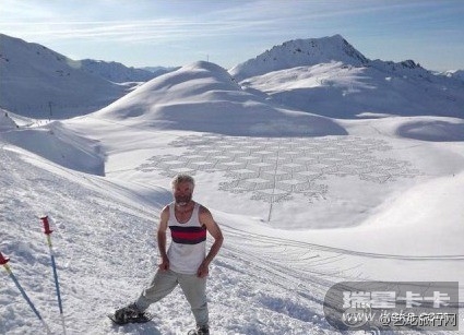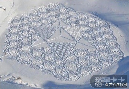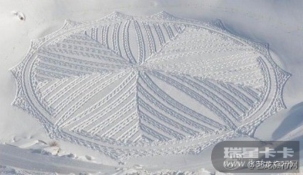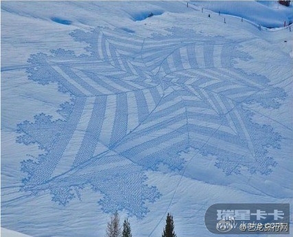 图为英国艺术家 Simon Beck在雪地上踏出的一幅幅精美的巨型画作。