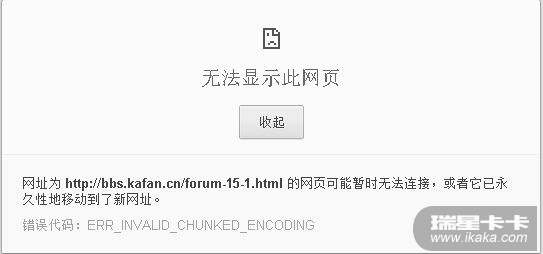 网址为http://bbs.kafan.cn/forum-15-1.html的网页可能暂时无法连接,或者它已永久性地移动到了新网址。错误代码:ERR_INVALID_CHUNKED_ENCODING