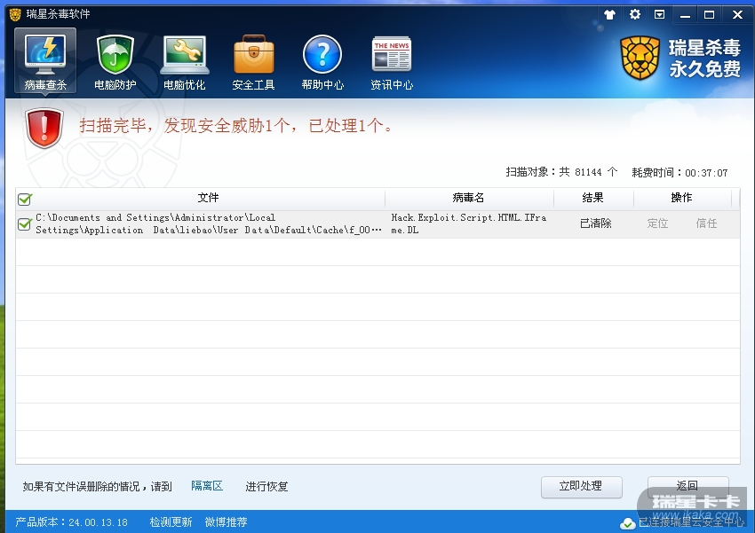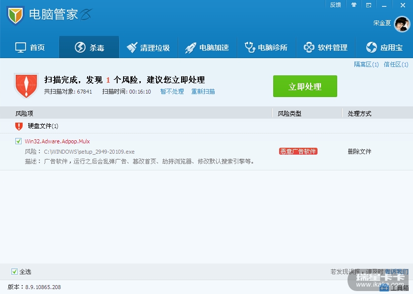 差距啊,管家的病毒扫描出来后还有病毒的解释,而瑞星则没有