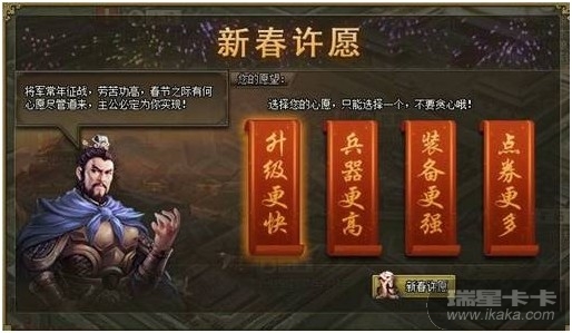 :1月27日0点-2月4日24点,玩家可以在“升级更快、兵器更高、装备更好、点券更多”四种愿望中任选其一,进行许愿;