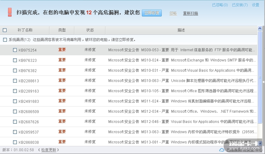 瑞星安全助手“漏洞修复”功能中,希望添加 漏洞补丁 发布的时间。