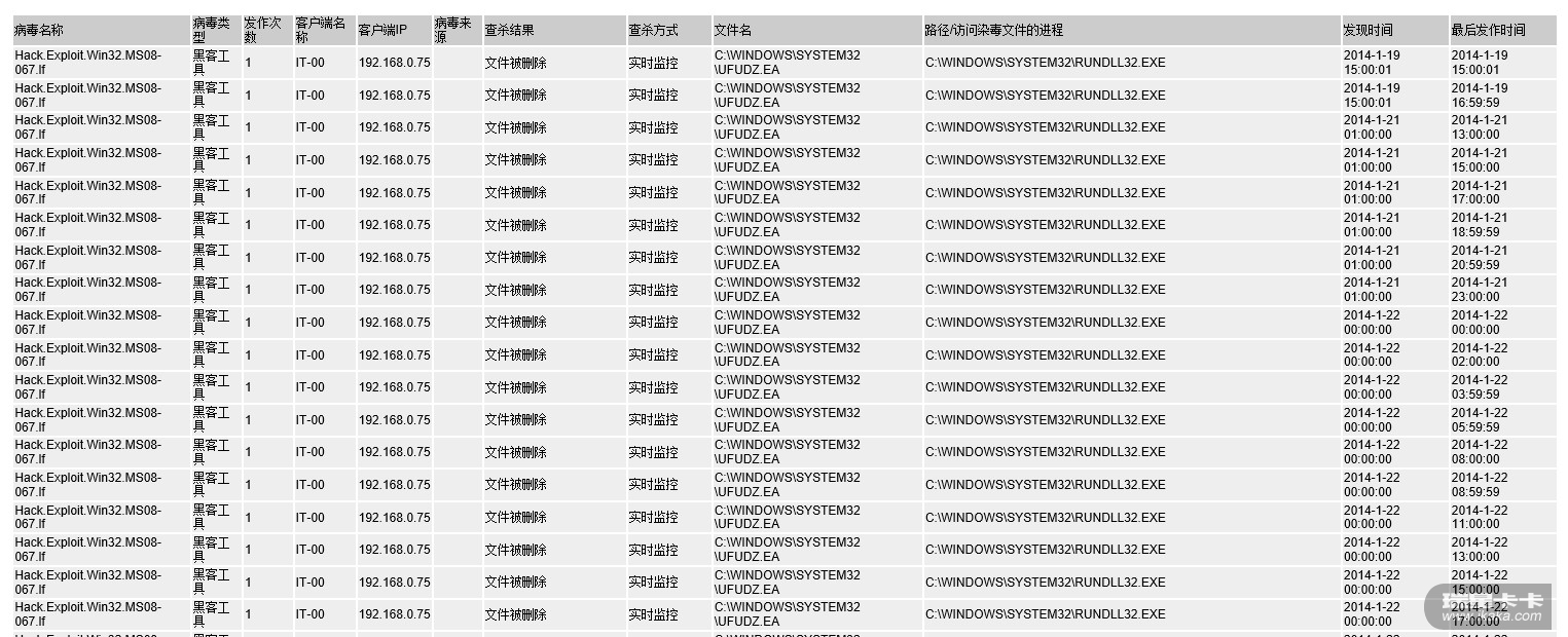 大家好,Hack.Exploit.Win32.MS08-067.lf病毒不停止地发作,瑞星可以自动监控到,并自动清除,但是无法彻底清除,全盘查杀后还是会有,见附件!