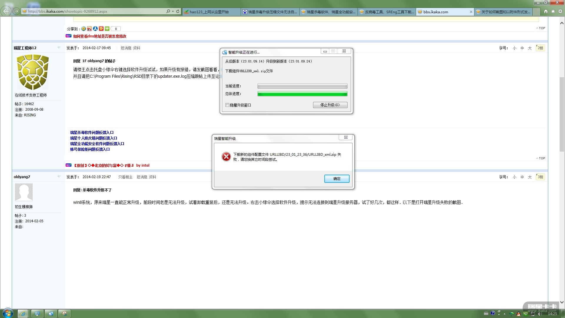 升级日志提供一下,瑞星安装目录下的RSD目录下的update.exe.log跟帖上传。