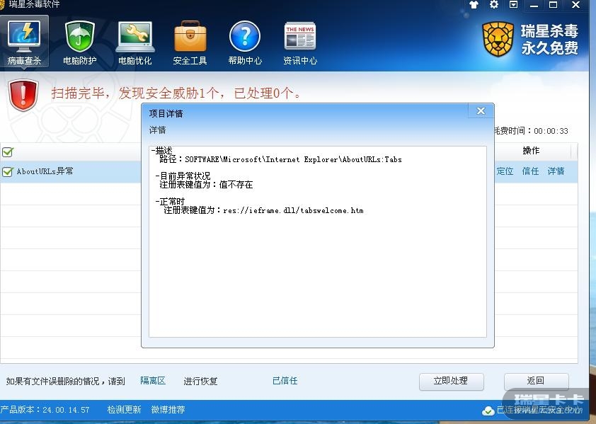 首页 » 个人产品讨论区 » 瑞星杀毒软件 » 瑞星杀毒软件V16+ » AboutURLs异常为什么总是修复不好?