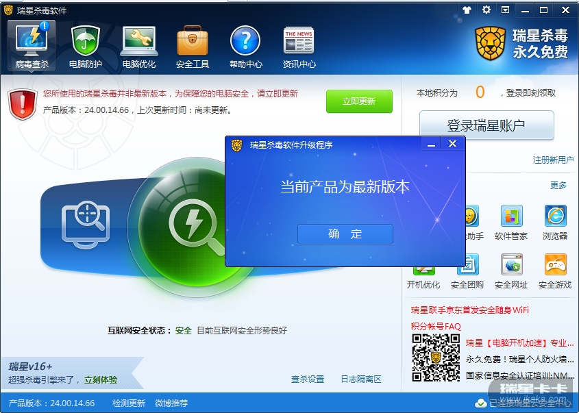 请楼主把鼠标放在托盘小绿伞上,看看病毒库版本是多少?