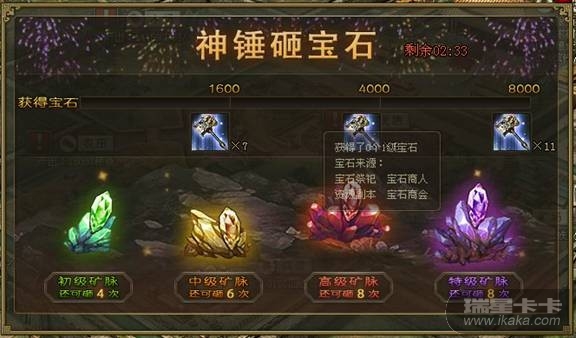 活动内容:活动期间,活动将记录通过宝石工坊、祭祀、资源副本、宝石商人获得宝石的数量,达到相应要求,即可获得神锤。获得宝石的数量要求、奖励宝石数量将随角色等级变化。获得宝石数量要求越高,奖励越高。