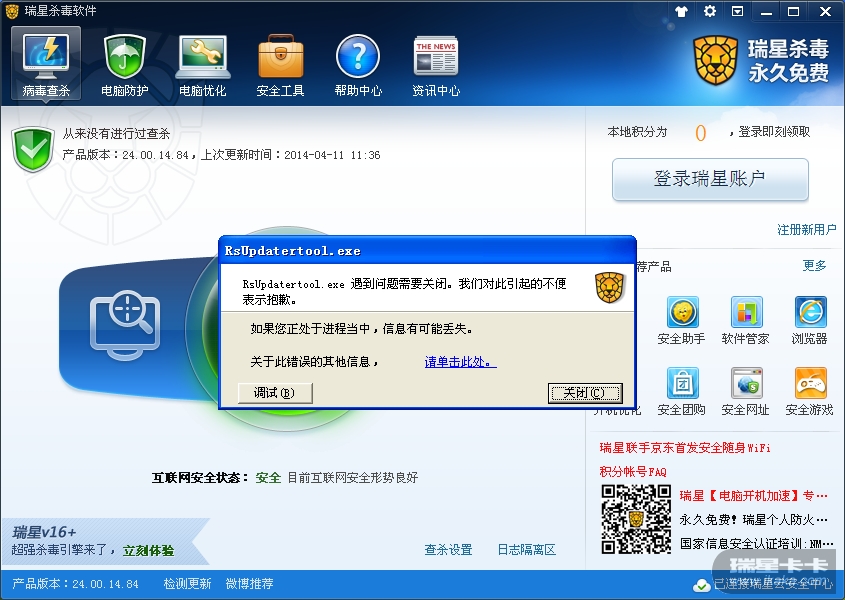 V16的问题层出不穷BUG多多,32位的系统,为什么不用瑞星2011版呢,既专业又稳定,win764位和win8.1才用V16版