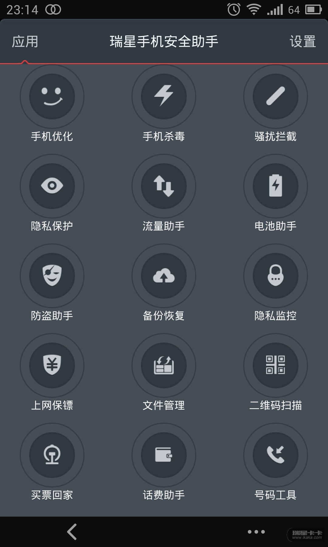 12.电池助手添加锁屏自动限频,自动清理后台程序。手机优化里面的软件管理添加瑞星瑞星手机应用中心,在有wifi的情况下提示更新。。。小圆圈显示网速,加入用户体验计划。。。