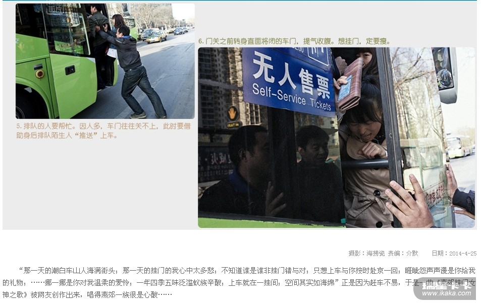 挤车,已经成为很多普通国人生活的一部分。早上睁开眼,就要投入挤车战斗;晚上下班,也得拖着疲惫的身躯将挤车进行到底。挤车,也早已成为不少国人须臾不可少的“生存技能”。挤车不相信眼泪,彬彬有礼玩绅士风度,或许就上不了车,就要迟到,就无法正常工作和生活。可以说,不会挤车的上班族不是合格的上班族,挤不上车的人不仅会被公交车抛弃,长此以往也会被工作甚至生活抛弃。