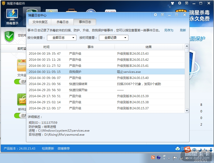 言归正传吧!在瑞星日志里发现了“自我保护”的信息。(如图所示)