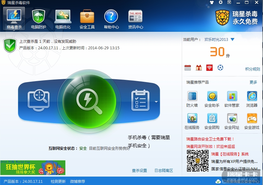 在电脑端可以杀毒(手机),但是需要瑞星手机安全支持。