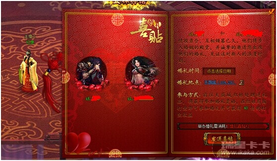 【婚礼】婚礼到期后,玩家可打开喜帖,点击立即参与,传送到对应NPC处,并打开NPC面板,赠送祝福后,将获得喜酒道具,双击使用可参与婚礼宴席。