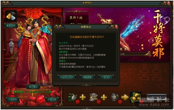 【离婚】当然,夫妻之间难免磕磕碰碰,有些不如意,【风云无双】同样提供了“离婚”功能,当您对配偶不满意时,可发起离婚。