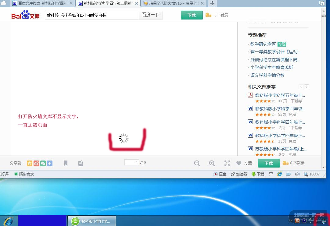 防火墙v16开启的时候用ie内核的浏览器访问百度文库,word页面较多时(我打开的是40几页和80几页的word),网页能打开,但不能显示word文档的文字内容,word页面一直加载中。关闭v16百度文库word文档显示一切正常。百度文库的其他格式文档pdf、ppt等浏览正常,每次浏览百度word网页只有关闭v16,希望瑞星v16