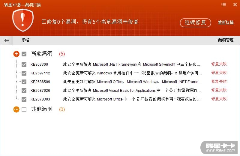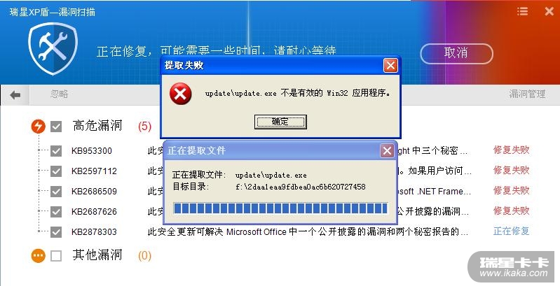 用瑞星修复高危漏洞时,KB953300、KB2597112、KB2686509和KB2687626这四个漏洞补丁下载完成后,提示正在修复,之后就是修复失败。KB2878303漏洞补丁下载完成后,提示正在修复,然后出现补丁程序提取文件窗口,再后来提示update\update.exe不是有效的win32应用程序,最后就是修复失败。