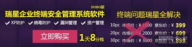 而瑞星ESM SOHO版则可以完美解决上述问题,其在杀毒及内网管理方面的性能大大优于免费的个人版杀毒软件,可以说是一款专门为普通网民及小微企业量身定制的专业信息安全解决方案。用户过瑞星ESM SOHO版通独有的审计控制台,只要几个简单操作,就可以完成XP防护、病毒防护、漏洞防护和资产管理等操作,轻松建立起一套安全、稳定、高效的网络安全系统。据博主了解,在产品测试期间,许多参与测试的小微企业表示,瑞星ESM SOHO版彻底解决了自己有需求无预算的困境,还享受到了免费产品不能拥有的专业技术支持,性价比极高。现在瑞星ESM SOHO版正在京东商城在线销售,提供10台PC、20台PC及30台PC三种套餐,价格分别为399元、699元及899元,相当于平均每台PC每天8分钱就可以享受一年的瑞星信息安全保护及专业级的技术支持。这相较于外国的防病毒产品,可以说是价格低廉量又足,有兴趣的用户快去抢购吧。