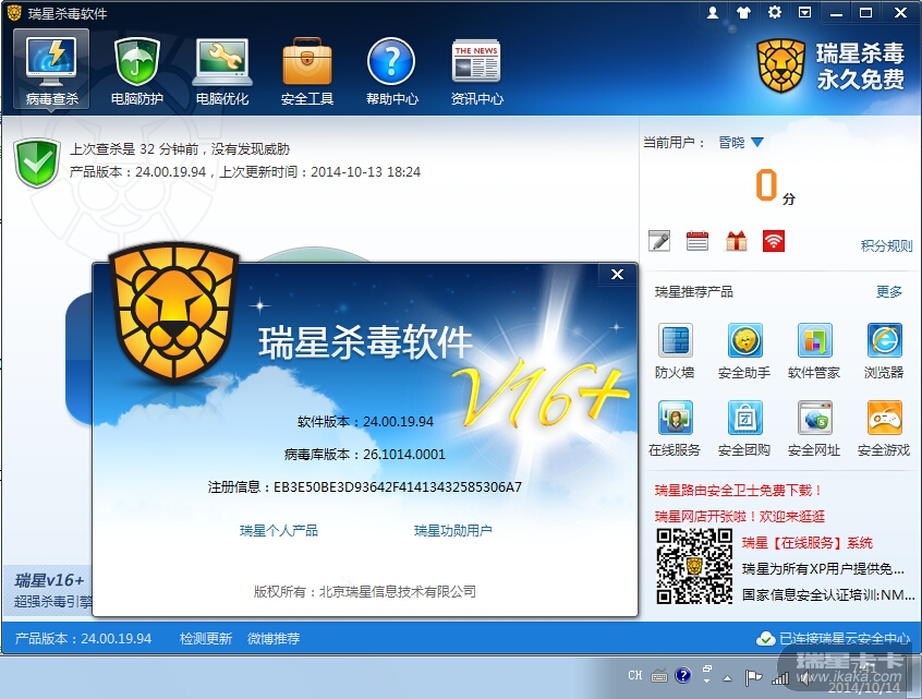 :kaka1: 瑞星工程师20,登录到网页用户中心后有积分。