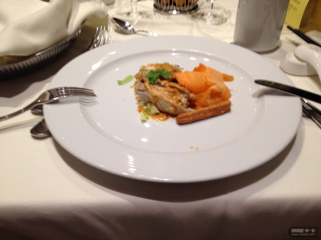每天一顿的正餐是晚餐,正餐指定餐厅及餐席,自上船至离船不变。我的正餐指定在序曲餐厅224席,临窗双人席(上船时床上放的一个小小纸卡片就是餐席证)。