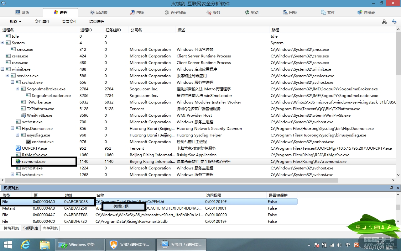 结果:瑞星的进程不能被关闭,但瑞星的 句柄可以被杀死!