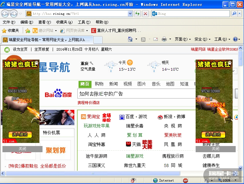 最近,打开IE老是会弹出一些广告有游戏的(如图),有时还有一些成年的黄色广告,IE的主页是受瑞星保护的,怎么会有广告呢?安装了广告拦截的插件,这些广告还是会出现,实在没想明白,想请教一下:如何屏蔽掉这些广告?