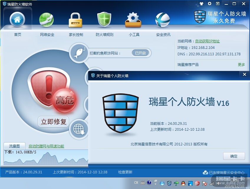 防火墙显示高危,提示安装瑞星路由安全卫士的问题,已解决。请把瑞星升级至最新版观察。