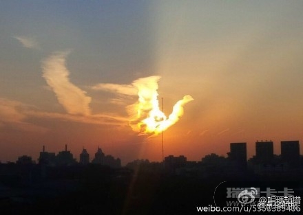 有多名网友拍到,今天北京天空出现了火凤凰状晚霞,真真是美翻了!据了解,凤凰(拉丁学名Phoenix Red)是中国古代传说中的百鸟之王,与龙同为汉族民族图腾。不过,也有吃货主义者风范的网友:这明明就是烧鸡。。。