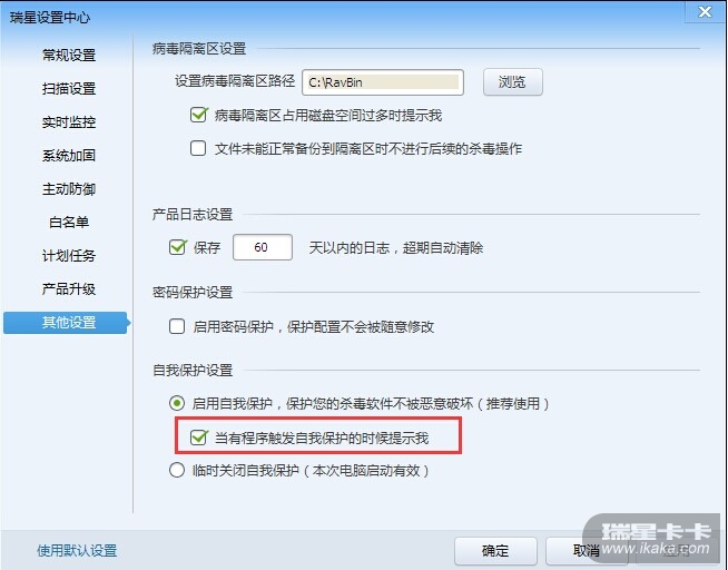 请楼主看看自我保护设置中,“当有程序触发自我保护的时候提示我”这项勾选了吗?