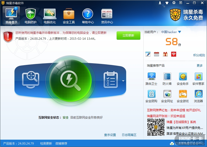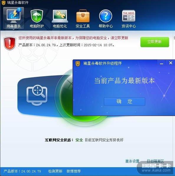 瑞星24.00.24.79主界面提示您所使用的瑞星杀毒并非最新版本为保障你的电脑安全请立即更新,显示上次更新时间为2015,2,14,13:44