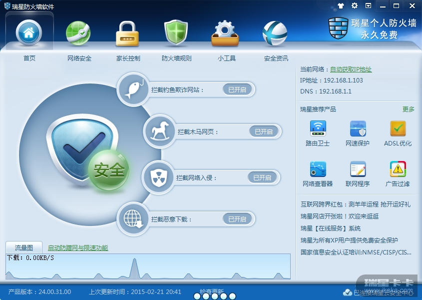 然后点立即更新 和检查更新均为当前产品为最新版本 瑞星防火墙是最新的显示产品版本为24.00.31.00 上次更新时间为2015,02,21,20:41, 而且一小时前更新过一次