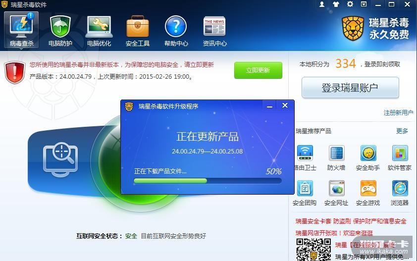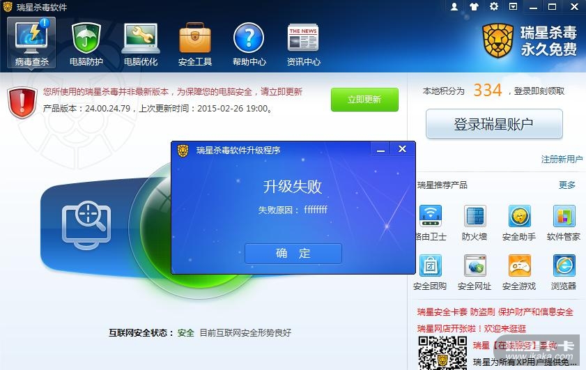 我的两台电脑都是不能升级,怎么回事,刚刚出现的这种情况,最新版本是24.00.24.74,公司里的电脑和家里的电脑都是这个现象,要说是网络问题我觉得不太可能.另外,公司里的电脑我卸载后下载了最新版本的瑞星安装后,版本号仍然是24.00.24.74,家里的这台电脑是2月初重装的系统,瑞星也是最新安装的,安装时间2015年2月5日.急等解决.